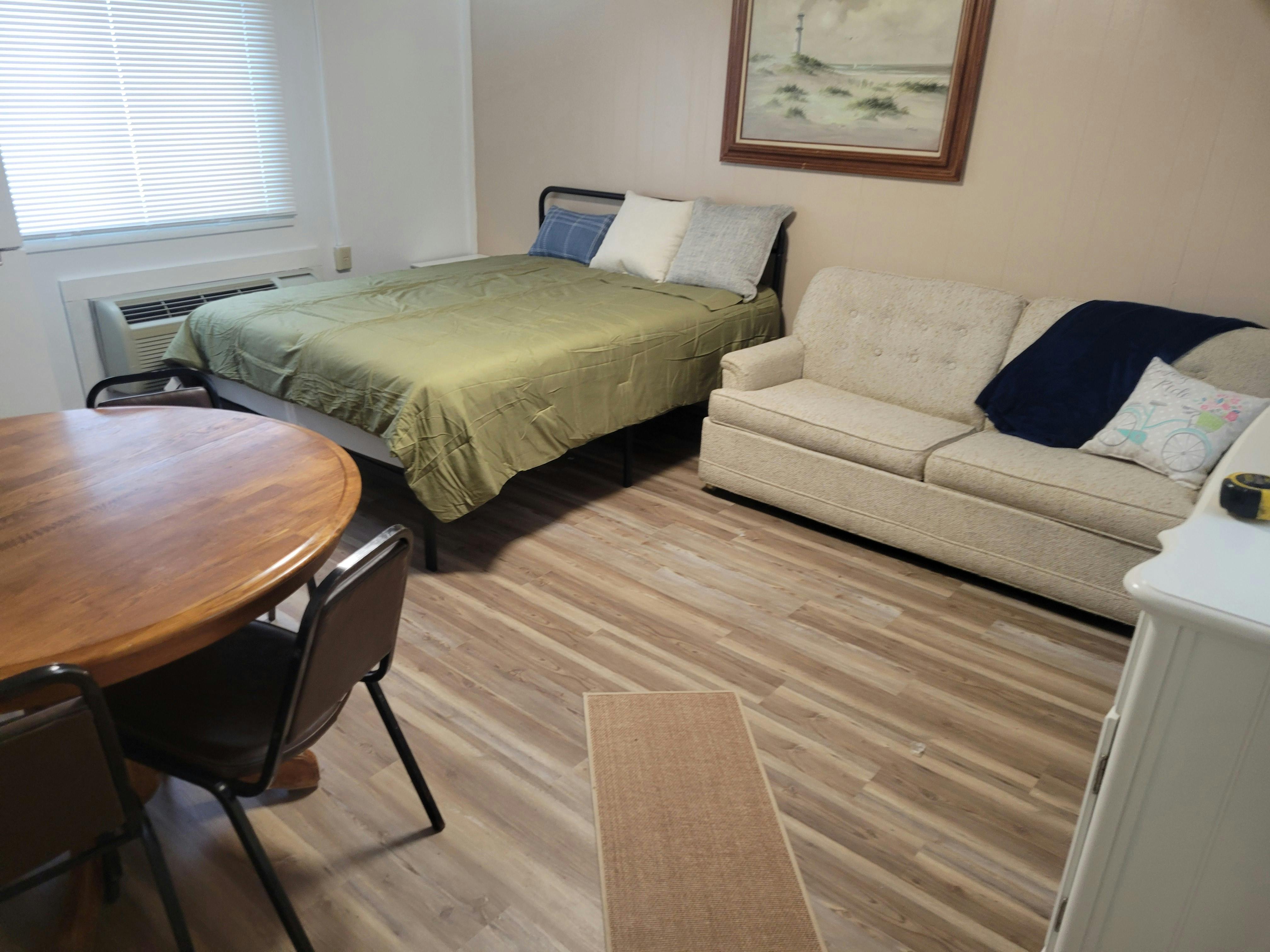 Studio type room with kitchenette. Premium Queen bed with Luxurious Linens. Pull out sofa bed for the extra guests!